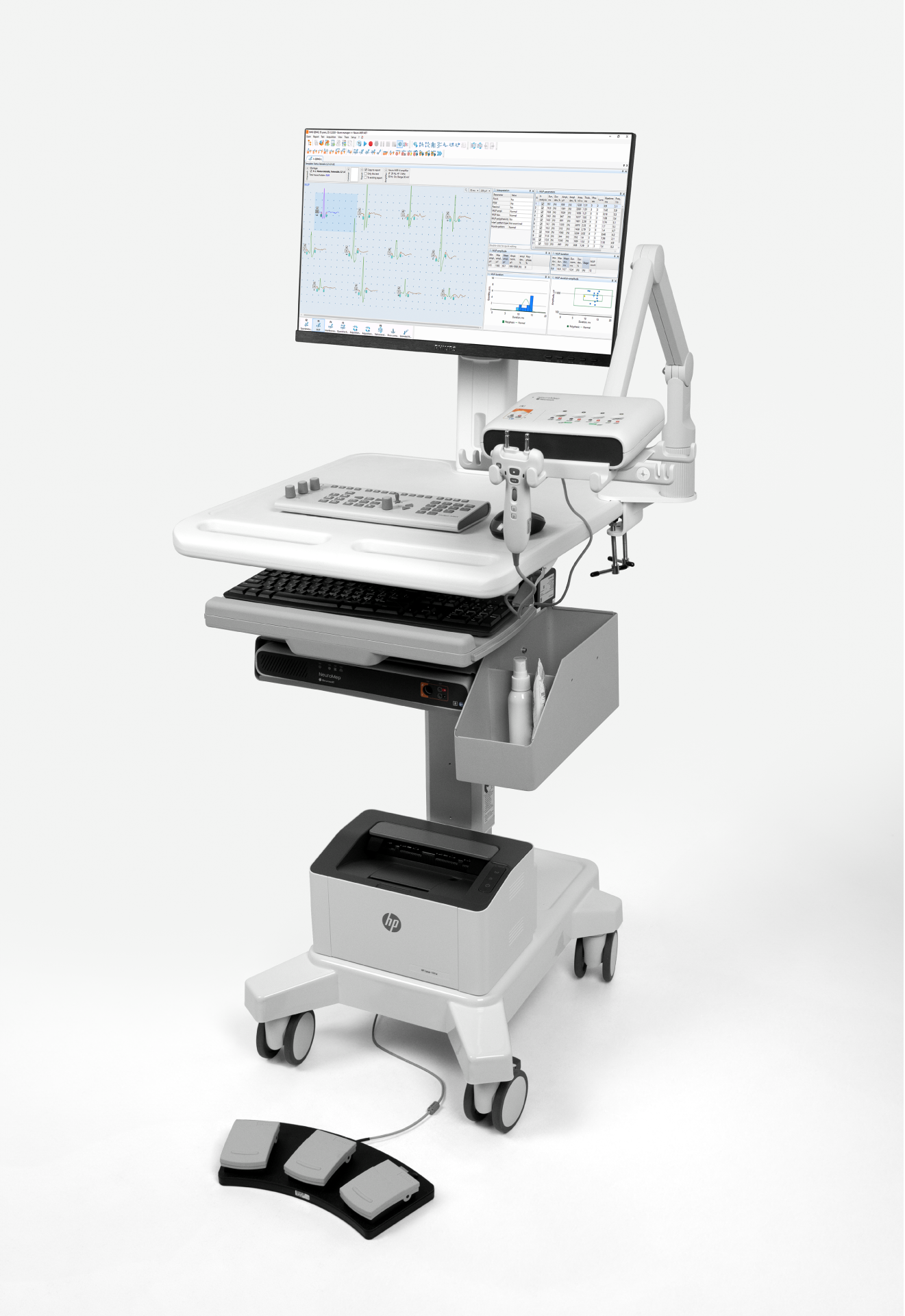 NeuroMep offers unprecedented capabilities for a full spectrum of studies: from standard stimulation and needle electroneuromyography to recording somatosensory, visual, auditory and cognitive evoked potentials. Thanks to its modular architecture, integration with ultrasound machines and compatibility with transcranial magnetic stimulators, the system is a flexible and scalable solution for any clinic or research center.