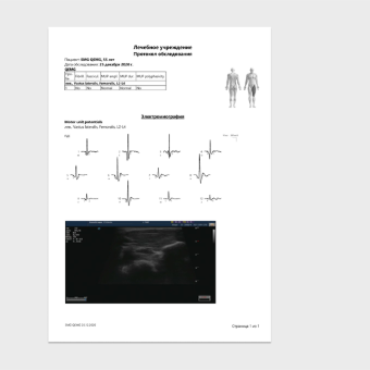 Также программное обеспечение позволяет сформировать протокол, содержащий в себе, как данные электромиографического исследования, так и изображения, полученные ультразвуковым сканером. Эти данные хранятся в архиве и при необходимости их можно просмотреть.